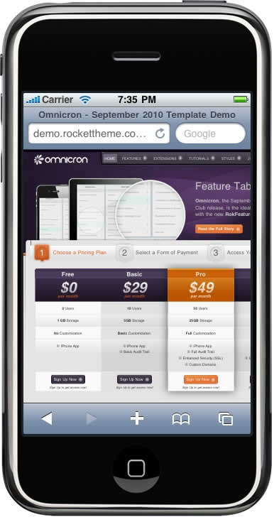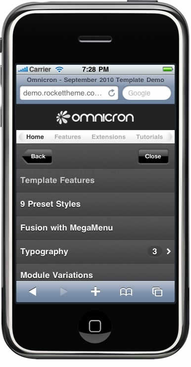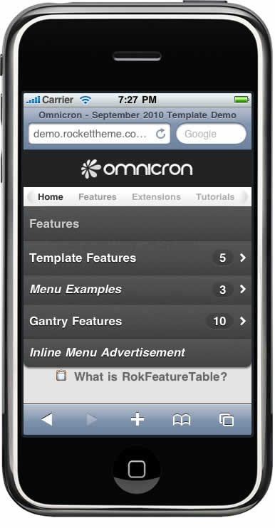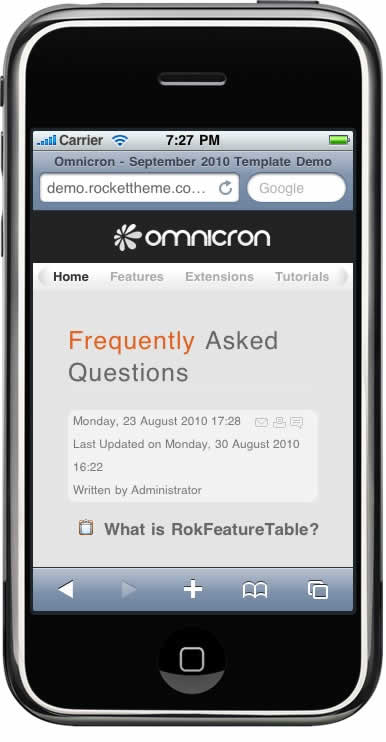 Gantry has support for the iPhone, providing you with versatile options to control how the template is loaded in the iPhone browser.